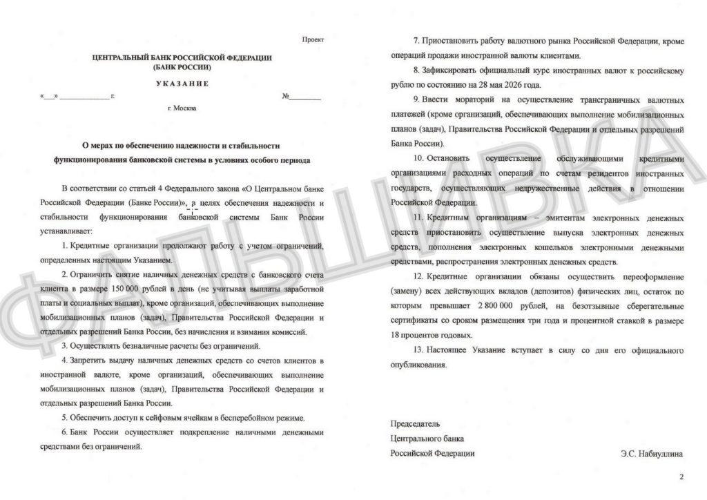 Распространяемый в Telegram «проект Набиуллиной» о заморозке вкладов свыше 2,8 млн рублей — фальшивка. Объясняем — почему.
