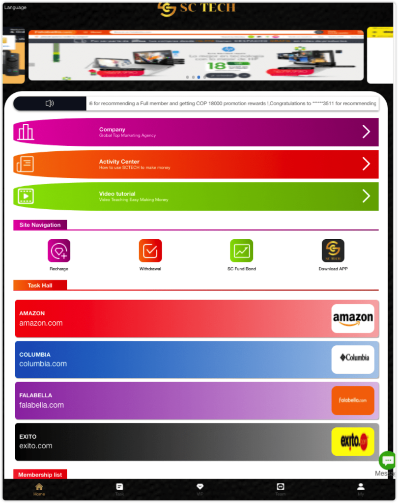 Например, на скриншоте ниже показана пирамидальная схема, утверждающая, что она сотрудничает с такими компаниями, как Amazon, Columbia, Falabella и Exito.