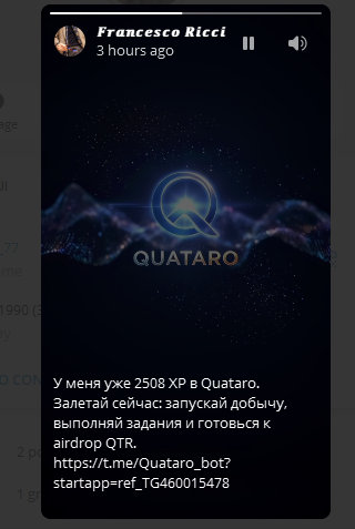 У меня уже 2508 XP в Quataro. Залетай сейчас: запускай добычу, выполняй задания и готовься к airdrop QTR. https://t.me/Quataro_bot.