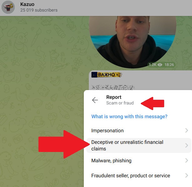 P.S. Товарищи обманутые, пожалуйтесь в Telegram на каналы мошенников. Метку scam администрация менеджера вешает, если жалоб достаточно. На посте с обещанием прибыли выберите Report | Scam or fraud | Deceptive or unrealistic financial claims.