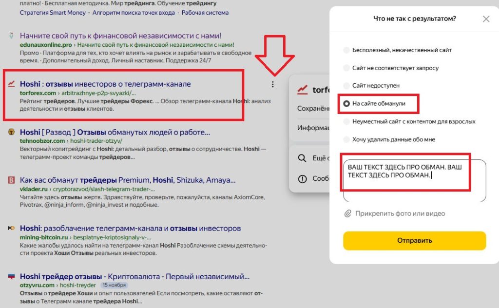 Яндекс на сайты, которые публикуют фальшивые отзывы на этих мошенников. Для этого наберите в поиск имя лохотрона, найдите положительный отзыв мошенников, нажмите три точки рядом с ним, выберите Сообщить об ошибке | На сайте обманули. И напишите кратко, что это отзыв фальшивый про телеграм-канал мошенников: