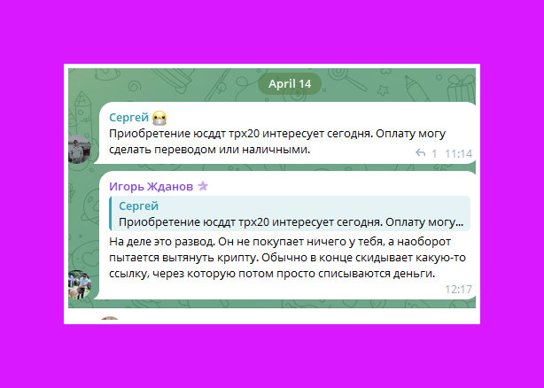 [14.04.2026 12:17] Игорь Жданов: На деле это развод. Он не покупает ничего у тебя, а наоборот пытается вытянуть крипту. Обычно в конце скидывает какую-то ссылку, через которую потом просто списываются деньги.Подписывайтесь на телеграм-канал Финсайд и потом не говорите, что вас не предупреждали: https://t.me/finside.