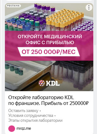 Франшиза федеральной сети лабораторий KDL предлагает: «Откройте офис медицинской лаборатории с прибылью от 250 000 рублей в месяц». Инвестиции от 3,4 млн рублей. Реклама от ООО «КДЛ ДОМОДЕДОВО-ТЕСТ», ИНН 5009046778, ID #316087233