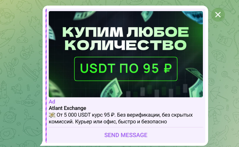«КУПИМ ЛЮБОЕ КОЛИЧЕСТВО USDT ПО 95 ₽. От 5 000 USDT курс 95 ₽. Без верификации, без скрытых комиссий. Курьер или офис, быстро и безопасно», — такая реклама. Представляются как Atlant Exchange, @a_atlantex. Что думаете? Почему дороже, чем доллар?»