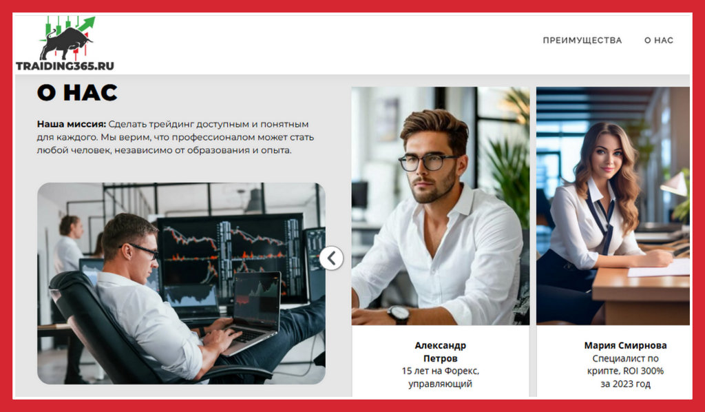 В интернете рекламируется сайт traiding365.ru, на котором представлена масса сгенерированных нейросетью людей. Например, такие поддельные отзывы: