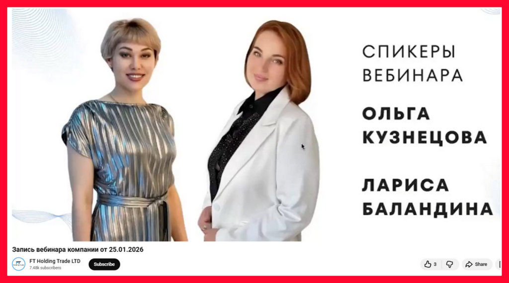 В ютуб-канале FT Holding Trade LTD (youtube.com/@FTHoldingTrade), где сказано, что «FT Holding Trade LTD — компания-холдинг профессиональных трейдеров, разработавших торговые системы высочайшего уровня, как в техническом наполнении, так и по обслуживанию клиентов — мы №1 на рынке! Торговля осуществляется по уникальной стратегии, которая позволяет приумножать капитал от 10% до 25% в месяц к депозиту».