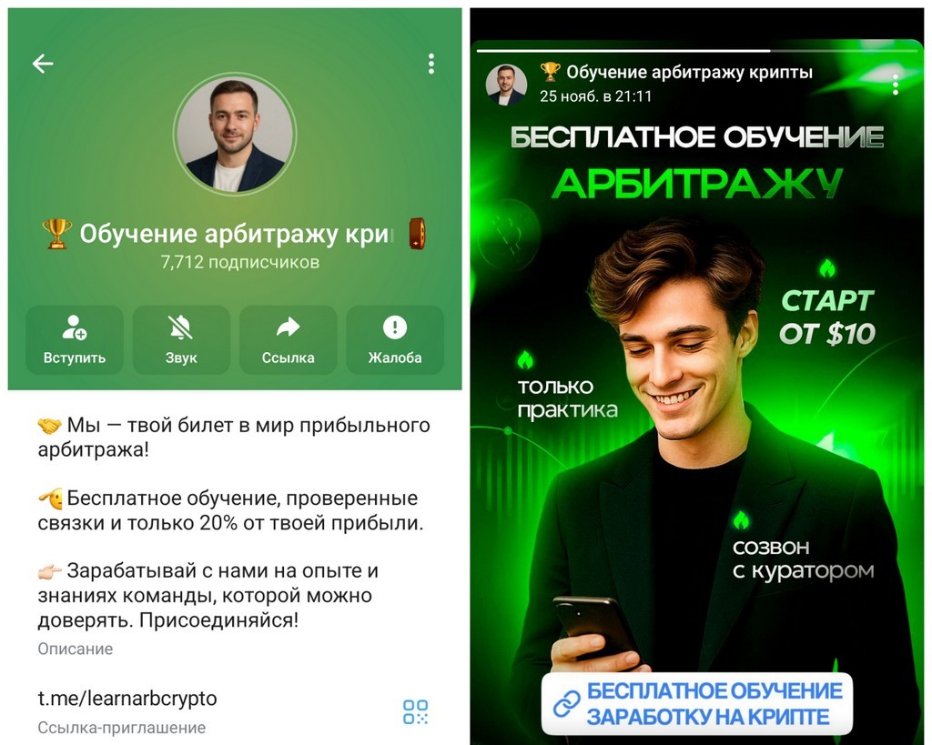 «Мы — твой билет в мир прибыльного арбитража! Бесплатное обучение, проверенные связки и только 20% от твоей прибыли. Зарабатывай с нами на опыте и знаниях команды, которой можно доверять. Присоединяйся!», — пишут жулики в описании канала.