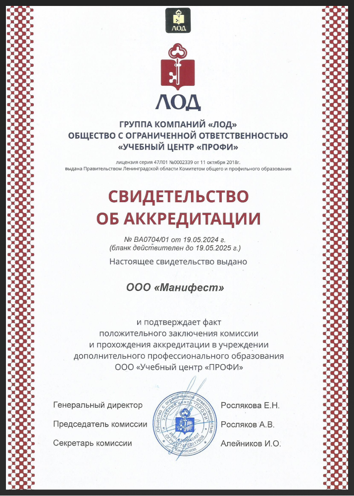 Здесь ещё серия новых названий: группа компаний «ЛОД», ООО «Учебный центр «Профи», ООО «Манифест», которых не было ни в рекламе, ни в реквизитах на сайте. Всё это подписано аж тремя людьми: Рослякова Е.Н., Росляков А.В., Алейников И.О.