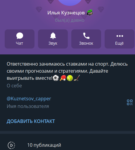 Мошенник под разными именами. Чувак предлагает угадай прогнозы на спорт, но ставить должен ты свои бабки , а прибыль потом пополам.Как только ты его называешь мошенником , он сразу материться — правда глаза колит. Он и Илья и Алексей (@morozovstav1t, @Kuznetsov_capper).