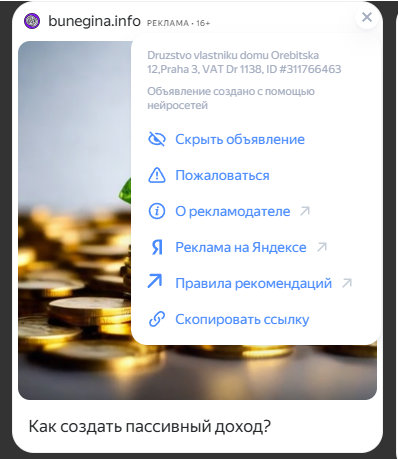 Однако к Т-Банку и Т-Инвестициям это отношения не имеет. Как рекламодатель сайта bunegina.info значится Druzstvo vlastniku domu Orebitska 12,Praha 3, VAT Dr 1138, ID #311766463.