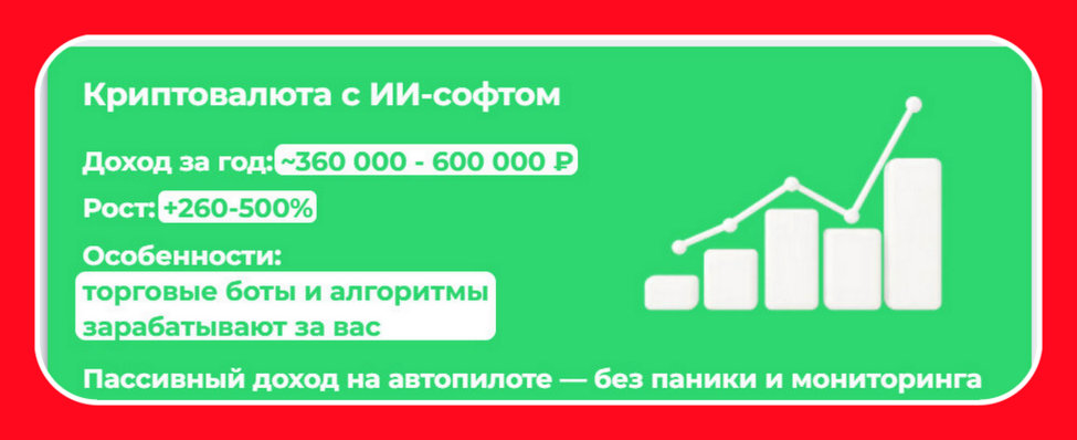 Здесь мальчонка нарисовался. Говорит про доход на «Криптовалюте с ИИ-софтом» в 260-500% в год. «Пассивный доход на автопилоте — без паники и мониторинга». «После курса используете работающие стратегии с ИИ, которые дают стабильный плюс 15-30% каждый месяц». Оцените честность и адекватность этого предложения (alexmethod.ru/white-new). Рекламодатель Никитин Александр Юрьевич, ИНН 027816451099, ID #315025777.