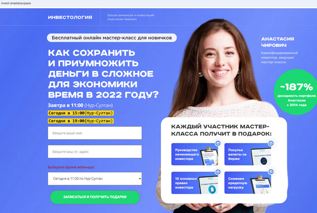 На главной странице сайта продвигается «Школа финансов и инвестиций Анастасии Чирович» с ориентацией на Казахстан, а на статье автор — Артём Халилов («финансовый аналитик… я и мои студенты заработали более $400 000»). .