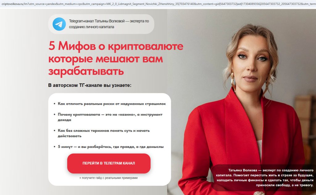 «Спасибо за ответ. Вот ещё реклама сайта и телеги Криптопенсия (@criptovolkova). Называет себя Криптоволкова. Рекламодатель ООО «СИНТЕРА», ИНН 9713030131, ID #312866857. Больно эта мадам лису Алису напоминает. Что скажете?»