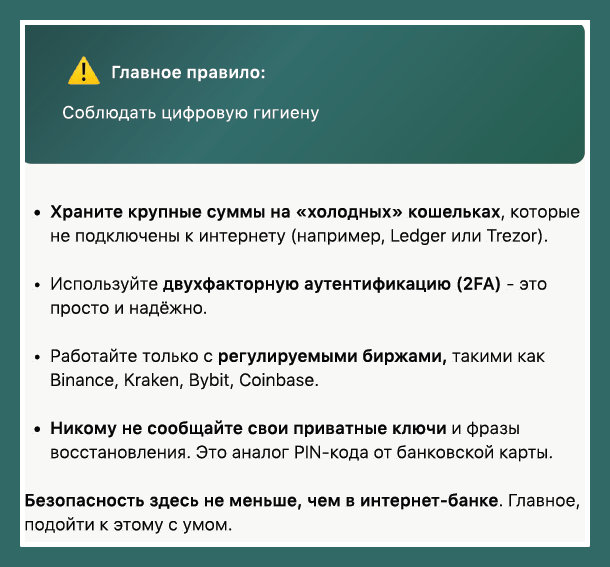 Похоже, мифы и советы писал искусственный интеллект, потому что совет «Работайте только с регулируемыми биржами, такими как Binance, Kraken, Bybit, Coinbase» релевантен для граждан других стран, а не России.