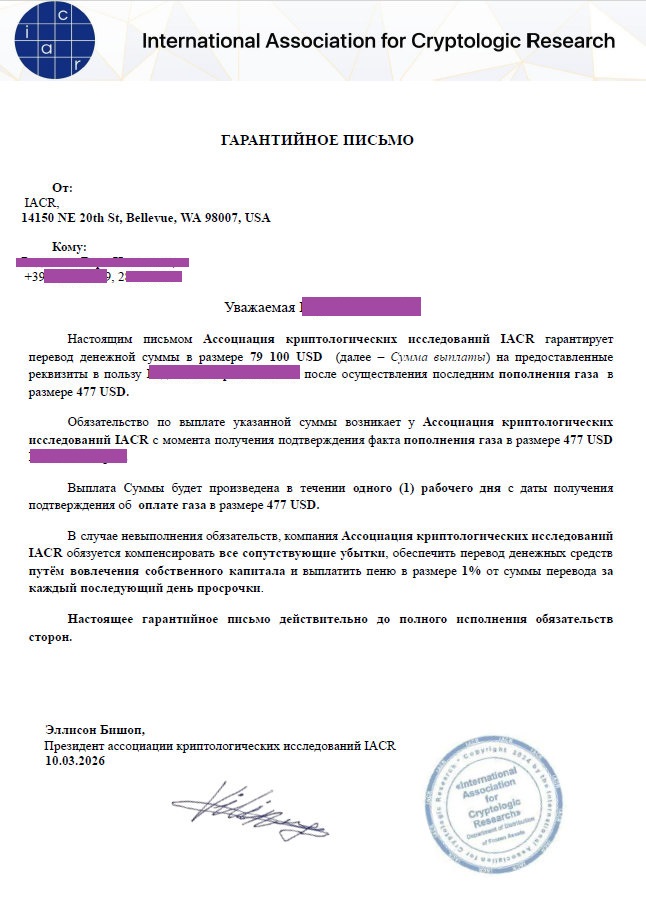 В письме используются громкое название, логотип, адрес в США, подпись и печать: «International Association for Cryptologic Research», «ГАРАНТИЙНОЕ ПИСЬМО», «Президент ассоциации…», печать и подпись внизу. Это нужно, чтобы у человека возникло ощущение: раз есть бланк, печать и иностранный адрес, значит всё официально. При этом публично IACR описывается как научная некоммерческая ассоциация, занимающаяся исследованиями, публикациями и конференциями по криптографии, а не выплатами частным лицам. В доступных публичных профилях Эллисон Бишоп фигурирует как вице-президент IACR, что ещё больше делает такое «гарантийное письмо» подозрительным. - Затем жертве показывают огромную «выплату».