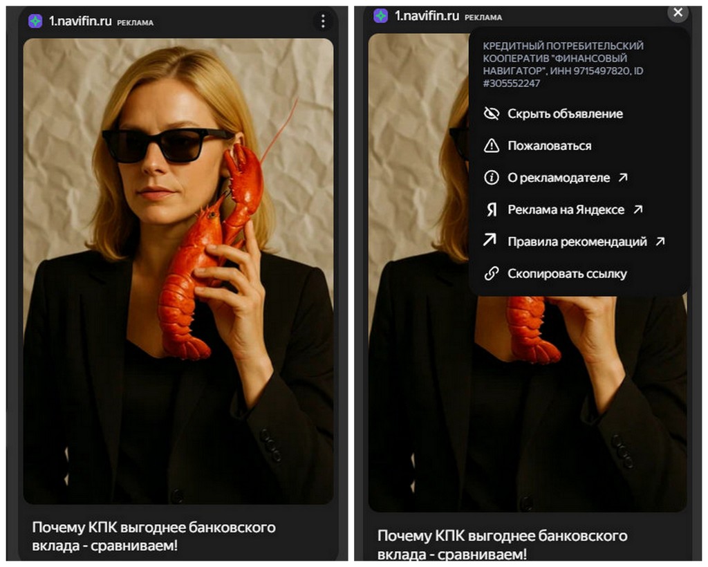 Выше реклама КРЕДИТНЫЙ ПОТРЕБИТЕЛЬСКИЙ КООПЕРАТИВ «ФИНАНСОВЫЙ НАВИГАТОР» (navifin.ru), ИНН 9715497820, ID #305552247. Что думаете?