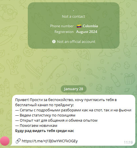 "Привет! Прости за беспокойство, хочу пригласить тебя в бесплатный канал по трейдингу: