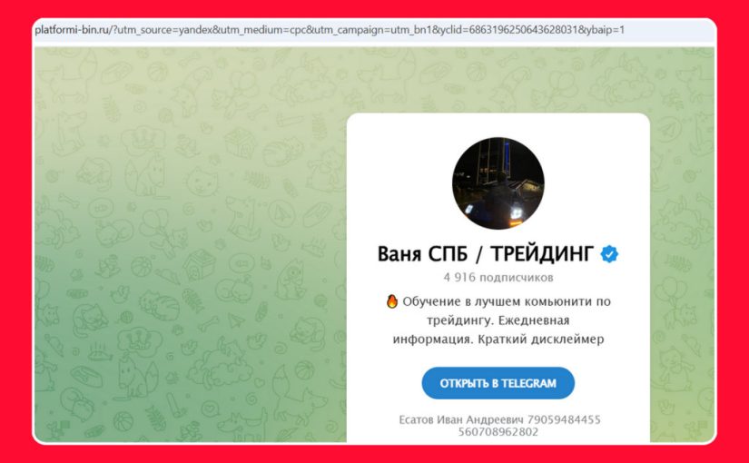 В интернете рекламируется сайт platformi-bin.ru. Он имеет дизайн как у десктопной версии Telegram и предлагает подписаться на канал «Ваня СПБ / Трейдинг» («Обучение в лучшем комьюнити по трейдингу. Ежедневная информация»).