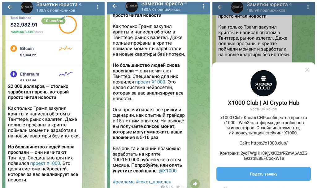 - Обещания кратных X и быстрых доходов «без опыта». Это несоразмерные обещания для розницы и классический триггер скама. «нейросети анализируют новости за вас», «список монет, которые могут умножить вложения в 5–10 раз», «без опыта можно заработать 100–150 тыс. руб. уже в этом месяце», кейс «на новые квартиры без ипотеки».