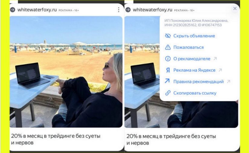 «20% в месяц без суеты и нервов». Такое заявление содержится в рекламе сайта whitewaterfoxy.ru (рекламодатель ИП Пономарева Юлия Александровна, ИНН 212302825162, ID #106747153). Оцените честность, законность, адекватность рекламы: