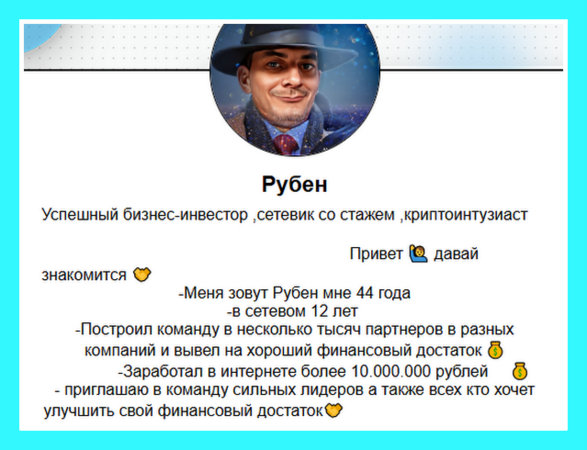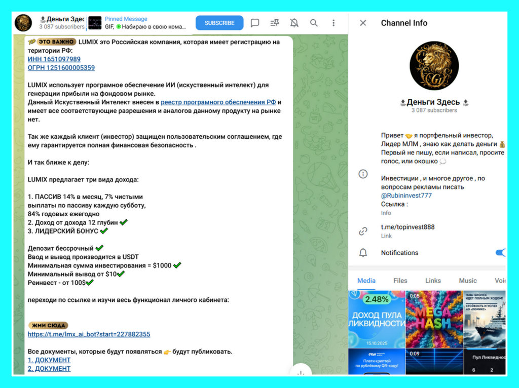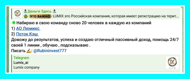 У него есть канал Деньги Здесь (@topinvest888), где в октябре 2025 года продвигаются две финансовые пирамиды: «Набираю в свою команду сново 20 человек в каждую из компаний 1) АО Люмикс 2) Поток Кэш Довожу до результатов, успеха и создаю отличный пассивный доход, помощь 24/7 своей 1 линии , обучаю , подсказываю . Писать @Rubininvest777».