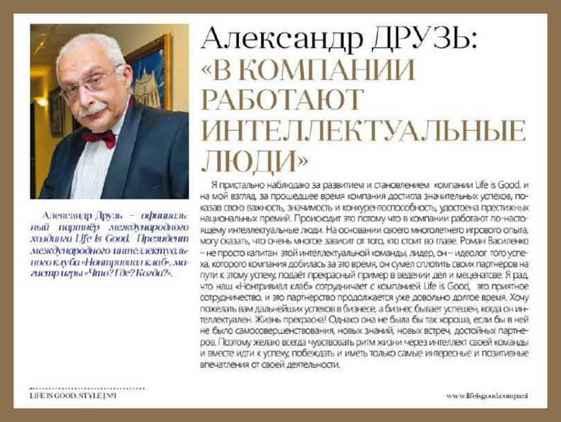 — Я пристально наблюдаю за развитием и становлением компании Life is Good, и на мой взгляд, за прошедшее время компания достигла значительных успехов, показав свою важность, значимость и конкурентоспособность, удостоена престижных национальных премий. Происходит это потому что в компании работают по-настоящему интеллектуальные люди. На основании своего многолетнего игрового опыта. могу сказать, что очень многое зависит от того, кто стоит во главе. Роман Василенко просто капитан этой интеллектуальной команды, лидер, он идеолог того успеха, которого компания добилась за это время, он сумел сплотить своих партнеров на пути к этому успеку, подает прекрасный пример в ведении дели меценатсве. Я рад что наш «Нонтривиал клаб» сотрудничает с компанией Life is Good, это приятное сотрудничество, и это партнерство продолжается уже довольно долгое время. Хочу пожелать вам дальнейших успехов в бизнесе, а бизнес бывает успешен когда он интеллектуален. Жизнь прекрасна! Однако она не была бы так хороша, если бы в ней не было самосовершенствования новых знаний, новых встреч, достойных партнеров. Поэтому желаю всегда чувствовать ритм жизни через интеллект своей команды и вместе идти к успеху побеждать и иметь только самые интересные и позитивные впечатления от своей деятельности.