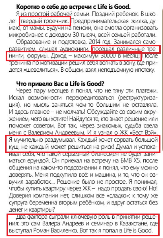 «Посещал различные тренинги, форумы. Доход — максимум 30000 в месяц! После тренинга по мотивации решил себя вогнать в зону, где придётся «шевелиться». В общем, взял неподъёмную ипотеку. Через пару месяцев я понял, что не тяну эти платежи. Искал возможности перекредитоваться (реструктуризация), но мысль заняться чем-то большим не оставляла… Судьба свела меня с Валерием Андреевым. И я узнал о ЖК «Бест Вей». Я мучительно раздумывал. Каждый хочет сорвать большой куш, не каждый может решиться на риск! Думал и успокаивал себя, что такой серьёзный бизнес не будет заниматься ерундой. Он приехал на встречу на BMW X5, после общения на каком-то подсознании я понял, что ему можно доверять. Меня подкупило всё: и машина, и то, что он озвучил заработок», — рассказывал в 2018 году Сергей Санников в корпоративном издании Life Is Good.