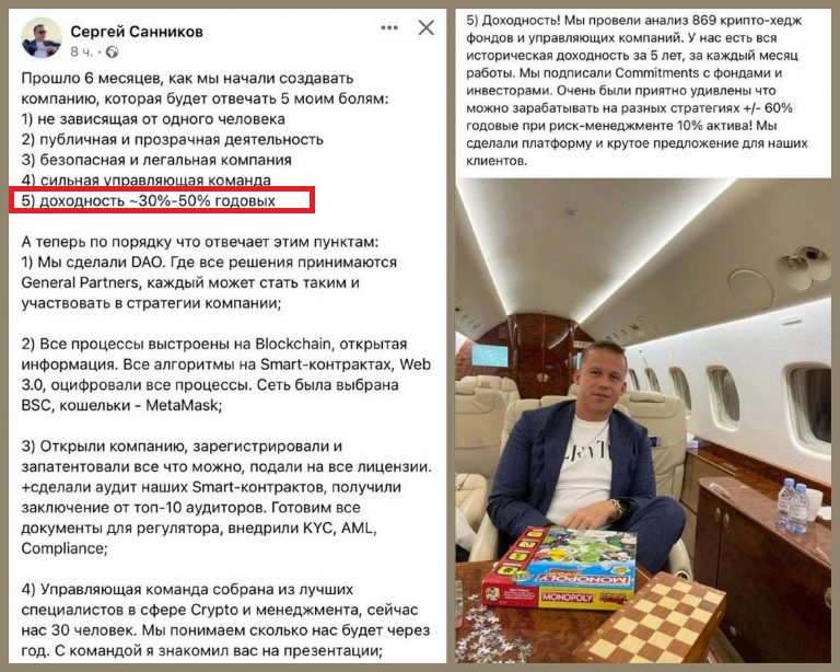 Когда запахло жареным, Сергей Санников распродал имущество и отчалил в Дубай, где летом 2022 года пытался организовать собственную криптопирамиду, обещая доходность 30-50% годовых.