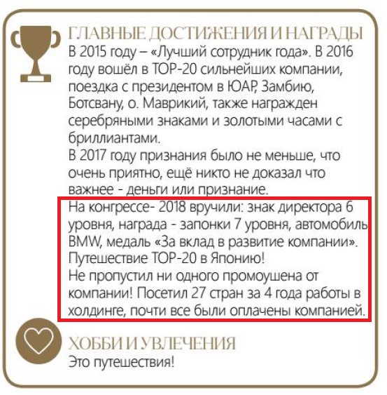 Он крайне активно заманивал новичков, получив уже в 2015 году звание «Лучший сотрудник года». В 2016 году вошёл в TOP-20 лидеров: «поездка с президентом в ЮАР, Замбию, Ботсвану, о. Маврикий, также награжден серебряными знаками и золотыми часами с бриллиантами. В 2017 году признания было не меньше, что очень приятно, ещё никто не доказал что важнее — деньги или признание. На конгрессе-2018 вручили: знак директора 6 уровня, награда — запонки 7 уровня, автомобиль BMW, медаль «За вклад в развитие компании». Путешествие в Японию! Посетил 27 стран за 4 года работы в холдинге, почти все были оплачены компанией.