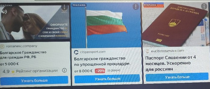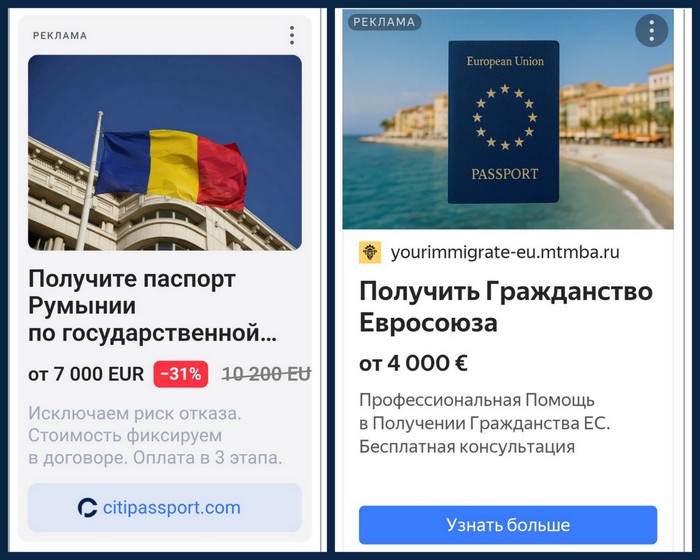 Добрый день, гражданства евросоюза не продают уже давно только по очень серым схемам и большие деньги. а тут как на духу яндекс и другие российские рекламные и баннерные сети его предлагают в огромном объеме. Эта та же история как фейсбук, у него кажется мошенической рекламы под 15% и он отказывается ее модерировать, хотя знает, что это.