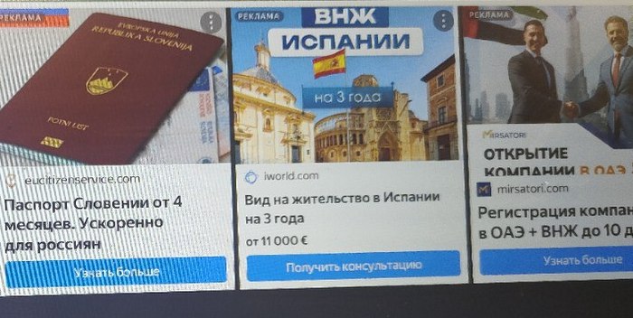 Все рекламируется через яндекс директ, а рекламодатель черт пойми кто. Напеример, «Организация Trust Group — получение гражданства Евросоюза, LUNCASU CONSULTING SRL, VAT 29352846, ID #93047236. Контакты Центральный федеральный округ, Москва, Бережковская набережная, 28, +40 31 229 82 91, +7 (939) 555-02-61».