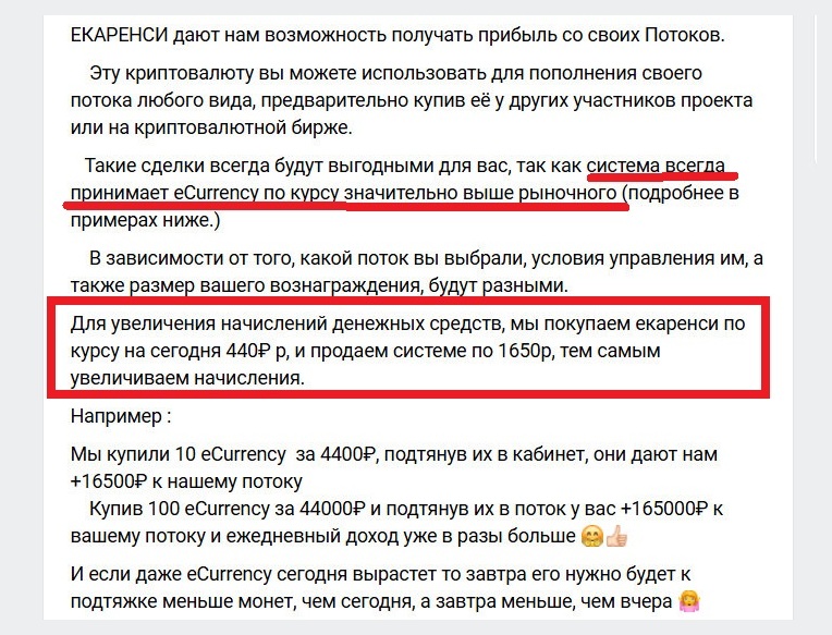 Вместо честного «вы получаете деньги новых вкладчиков» рассказывают историю про «подтяжку курса eCurrency», «органичный рост с 2018 года» и т.п. - Удобно отрезать людей от реального рынка.