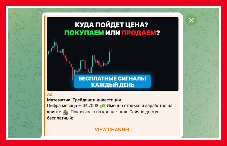 В Telegram рекламируют канал «Математик. Трейдинг и инвестиции». Якобы ведёт его аналитик инвесткомпании с 7-летним опытом. «Торгую, тестирую стратегии и делюсь реальными наработками. Без пустых обещаний — только аналитика и проверенные подходы!», — таково описание.