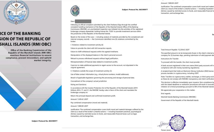 Компенсация в USDT и через счёт у того же брокера. Настоящий регулятор не будет считать компенсацию в стейблкойне USDT, а тем более «замораживать» её на вашем торговом счёте у подозрительного брокера. Официальные органы работают с банковскими счетами в фиатной валюте (USD) и через банки/суды, а не через внутренние кабинеты псевдоброкеров.